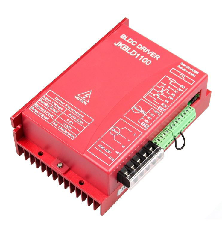 JK1100 je drajver za motore bez četkica. Podržava DC motore bez četkica sa tri faze sa maksimalnom strujom do 5A. Ulazna struja je AC80V-250V . Podržava motore i sa i bez HALL senzora.