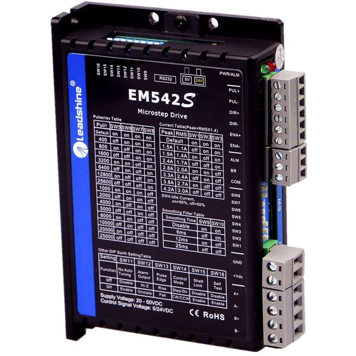 EM542SS može da pokreće dvofazne i četvorofazne koračne motore veoma glatko, uz vrlo malo zagrevanje motora i nizak nivo buke. Podržava ulazni napon od 20–50 VDC i izlaznu struju od 0,5–4,2 A. Tip upravljanja (step & direction ili CW/CCW) i vreme filtriranja komande (command smoothing time) mogu se lako konfigurisati putem DIP prekidača. Zbog toga je EM542S idealan izbor za mnoge primene koje zahtevaju jednostavno upravljanje NEMA 17 i NEMA 23 koračnim motorima preko step & direction ili CW/CCW signala.