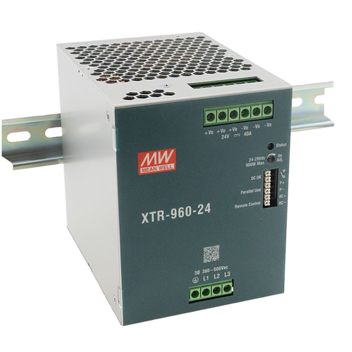 Napajanje za DIN šinu Mean Well XTR-960-48 serije XTR od 960W, ulaznog napona od 320-600VAC, izlaznog napona od 48V i maksimalne struje do 20A. Garancija 3 godine.