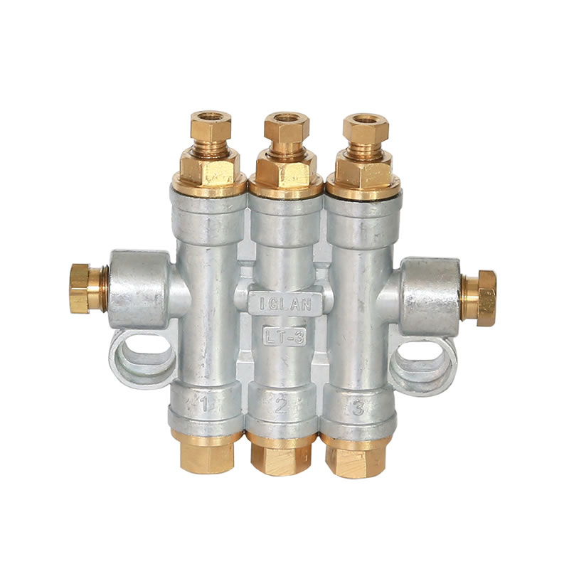 Volumetrijski razvodnik za ulje/mast sa dva ulaza za crevo od 6mm i 2 izlaza za crevo prečnika 4mm. Dozirana zapremina po izlazu je 0.3ml.
